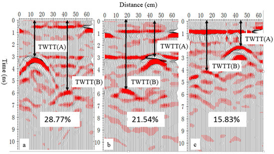 GPR reflected wave image features for the red sandstone soil. Note: TWTT(A) and TWTT(B) represent the two-way travel times of reflectors A and B, respectively; the SWCs of (a–c) are 28.77%, 21.54%, and 15.83%, respectively. The survey directions of panels b and c are opposite to that of panel a.