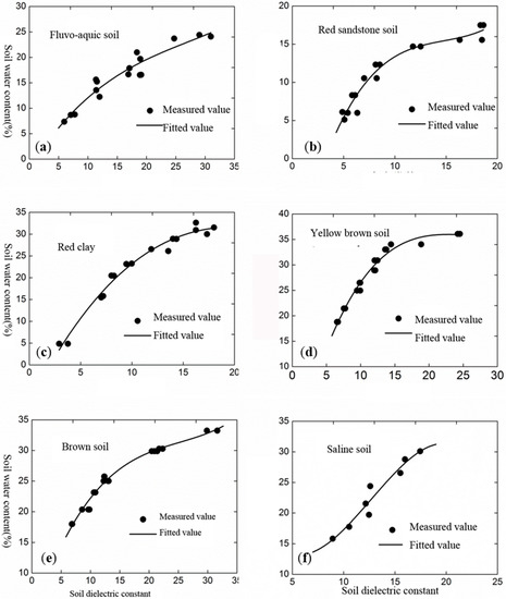 Fitted curves between the soil dielectric constant and SWC. (a) fluvo-aquic soil; (b) red sandstone soil; (c) red clay; (d) yellow brown soil; (e) brown soil; (f) saline soil.