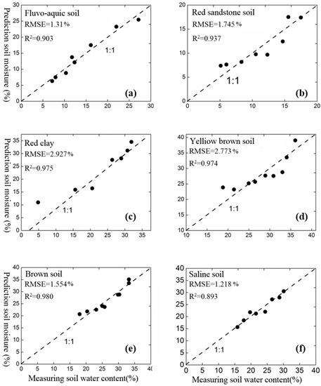 Regression analysis of the measured SWC and the θ ~ ε model-retrieved SWC. (a) fluvo-aquic soil; (b) red sandstone soil; (c) red clay; (d) yellow brown soil; (e) brown soil; (f) saline soil.