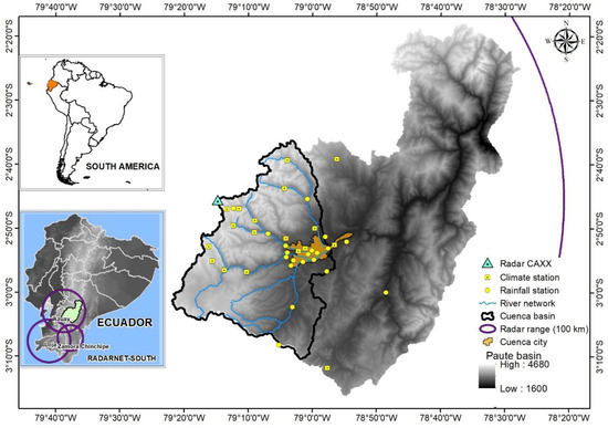 Study Area: Paute River basin, CAXX 100-km radar range, rain gauges, and climate stations. Lower left inset: radar network RadarNet-Sur.