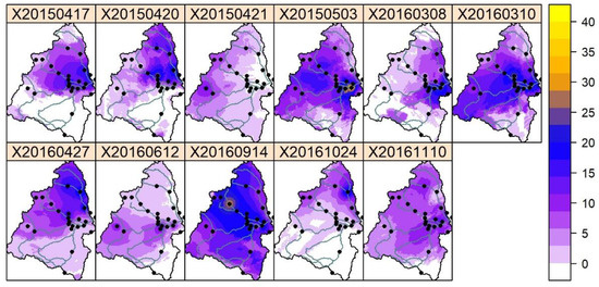 A total of 11 rainfall events were examined from March 2015 to December 2016 (Table 2 and Figure 3). For the rain event selection, three criteria were considered: (i) events with very high rain intensities, (ii) events taking place in the wet or dry season of the study area, with the objective of analyzing the entire rainfall seasonality, and (iii) events with a large spatial extent, covering at least 20 rain gauges within the study area. For each event, the maximum rain intensity was calculated considering a temporal aggregation of 5 min and 1 h. Details for all events are shown in Table 2.