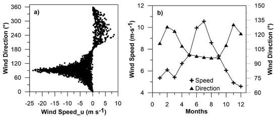 Wind speed and direction at 4450 m a.s.l. estimated with the National Centers for Environmental Prediction (NCEP)-FNL data. (a) Relationship of the wind speed on the X-axis (positive values towards the east and negative values towards the west) with the wind direction (90° indicates the direction from the east to the west). (b) Monthly average distribution of wind speed and direction.