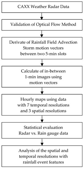 The workflow of the study is depicted in Figure 5. The first step was to enhance the temporal resolution of the radar data. The radar captures rain images every 5 min. However, for this study, 1-min-interval rain images were required. Therefore, rain motion vectors between two consecutive image slots were calculated through a rain advection model and validated for the local conditions. Then, 1-min-interval images were calculated for each rain event by using the motion vector fields. The second step was the estimation of hourly rain maps in the different spatial and temporal resolutions (0.50, 0.25, and 0.10 km; 1, 5, 10, 15, 20, 30, and 60 min), including the artificial subslot 1-min-interval images. Then, a statistical evaluation of hourly radar rainfall maps was conducted with hourly rain gauge totals to show the general accuracy of QPE. Finally, the impact of different temporal and spatial resolutions of radar data on QPE was analyzed for different rainfall characteristics (horizontal rain field speed, rain total volume, spatial coverage percentage, and maximum rain intensity).