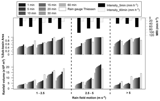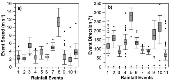 Figure 13 shows the relation among the maximum rainfall intensities (MRI), the rainfall motion (RM), rainfall volume, and spatial coverage percentage of the 11 events. Events with an RM greater than 5 m s−1 presented relatively low MRI for hourly data (13.46–17.10 mm h−1). The highest MRIs estimated with 5-min-interval data were recorded for the events between the RM ranges of 1–2.5 and 2.5–5 m s−1, with values of 110.3 and 103.20 mm h−1, respectively. These results can be attributed to the different types of precipitation that are generated in these ecosystems [44,46]. The heavy rain structure consists mainly of drops with mean volume diameters (Dm) greater than 1 mm [46], which in turn makes it difficult for the wind to move them easily, therefore obtaining a low average rainfall motion (1–2.5 m s−1).