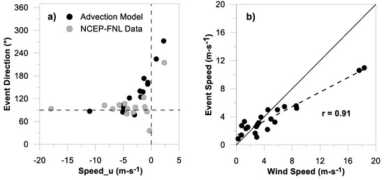 (a) Distribution of the wind speed and direction of the re-analysis data in contrast to the rainfall motion generated by the optical flow method for all precipitation events (negative event speed indicates that precipitation is moving west). (b) Hourly speed correlation generated by re-analysis data (X-axis) and the advection model (Y-axis) for the 11 events.