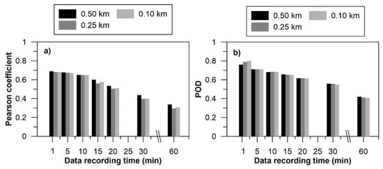 Variation of the Pearson correlation coefficient (a) and the probability of detection index (b) according to the sampling time and pixel resolution.
