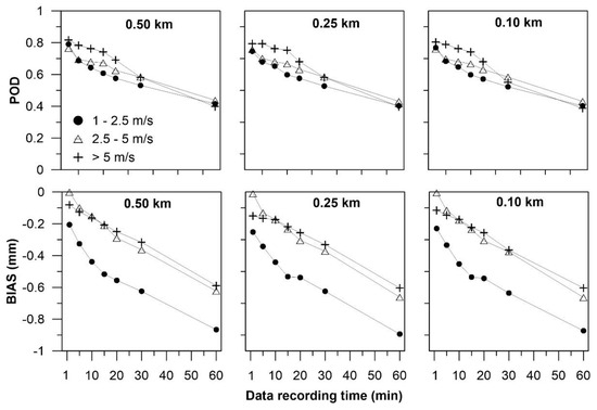 Figure 9 shows the POD and BIAS discretization of the radar–rain gauge relation as a function of the average rainfall motion (RM). There is a strong relationship between the POD and BIAS with the RM. The POD values were higher in the event of higher RM (RM > 5 m s−1). The lowest POD values occurred for RM between 1–2.5 m s−1. Although the POD differences for 1-min-interval recorded images were less than 6% between the three speed ranges, this percentage increased to 11% after 5 min. However, the difference again decreased for 60 min (5%).