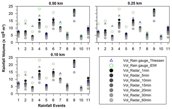 Accumulated rainfall volume (m3) for the 11 events according to the different radar temporal and spatial resolutions.