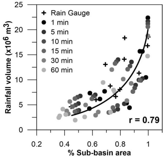 There is a remarkable relationship between the spatial rainfall coverage over the basin and the rain total volume (Figure 11). This relationship is not linear, because it depends on other event characteristics, such as intensity and duration [28]. In this case an exponential relation was found (r = 0.79). Nonetheless, the coverage percentages estimated with the rain gauge network differed from those estimated by the radar data. For instance, for the event on 04/17/2015, using only the rain gauge network data, the rainfall precipitated over 80% of the sub-basin’s total area calculated with the Thiessen method and 100% of the sub-basin’s total area calculated with the IDW method (Figure 12). Nonetheless, when using the higher temporal resolution, 1-min-interval radar data, with 0.5-km pixel size, it was identified that the event covered only 58% of the basin. A possible explanation for this might be that the IDW method interpolates the rain for the whole study area, even where no rainfall is recorded. For this reason, the estimated rain volumes are greater than those calculated using the Thiessen method and those observed by the CAXX radar.