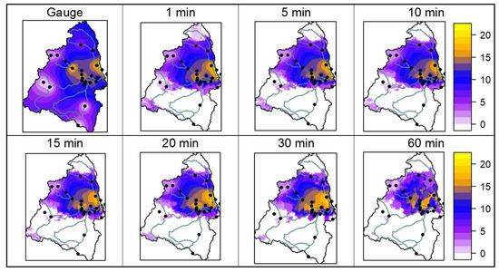 The BIAS decreased 0.1 mm on average for the three spatial resolutions when 1-min-interval data was used. This is equivalent to enhancing the estimate by 40% by using 1-min-interval data instead of 5-min-interval data, which seems to be consistent with the results (30%–60%) found by [31]. Moreover, in agreement with the previous results, the detection index improved significantly (10%) when using 1-min-interval interpolated images.