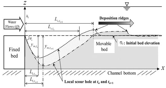 where, is the critical specific energy in proximity of the sill , q is the discharge per unit width, g is gravitational acceleration, is the morphological jump and the range of is from 1.3 to 9.1, and are, respectively, the initial and equilibrium longitudinal bed slope. L is the distance between two successive sills, is the relative submerged particle density, and are, respectively, the submerged sediment and water density. denotes the grain size for which 50% of the total weight of the sediment is finer. Gaudio and Marion [16] insisted that the Froude number has no influence on the dimensions of the scour hole and its temporal development. However, the range of the Froude number, which they analyzed, is quite large, 0.64–0.93. Therefore, the local scour with flow conditions of relatively low Froude number (less than 0.5) due to various operations of hydraulic structures should be analyzed to reveal the influence on the local scour. Lenzi et al. [8] analyzed several experiments about the presence of bed sills upon the scouring process and profiles. Also, they revealed that the length of the scour hole may be the dominant scale of the whole process until the equilibrium condition was reached, which is controversial.