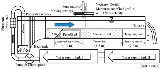 Laboratory experiments were carried out in a recirculating, 17.5 m long, 0.6 m wide, and 0.8 m deep flume. A schematic diagram of the flume and its system is shown in Figure 3. A head tank for stabilization of water supply, 2.9 m long, 1.2 m wide, and 1.5 m high, was connected to the flume inlet and two perforated panels and submerged wall, which can effectively remove irregular water surface undulation induced by the circulating pipe. A pair of sump tanks for water supply, storage, and sediment entrapment was installed below the flume bottom and they were connected to a closed conduit. Length of open channel for the test was 15.0 m. At the end of the flume, a tailgate which was made of a steel plate was setup to control water surface elevation. To conduct the experiments, approaching wedge model for the stabilization of inflow was positioned at 3.0 m behind the head tank of the flume and 4.0 m long and 0.2 m high acrylic box model for the protection of initial erosion was attached behind the wedge. 8.5 m long test section, which was installed at 2.5 m upstream from the tailgate of the flume, was filled with sand. Discharge from the inlet was monitored by ultrasonic flow-meter in the middle of inlet pipe and controlled by control panel automatically (Figure 3; [17]).