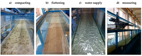 At the beginning of the scour test, appropriate filling of sand bed in the test section is the most important procedure. Firstly, dry sand in the test section was filled, packed, and flattened into initial bed elevation (η = 0.2 m) from the channel bottom and then the desirable value of water depth was reached with tap water supply to keep the initial movable bed elevation. Secondly, elevation of movable bed was flattened again to reduce the soil pore with slight compaction. Then applying small water discharges in which no significant sediment load in each case occurred were supplied gradually. Lastly main scour tests were started (Figure 5).