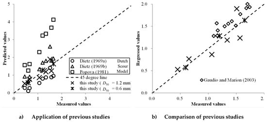 A nonlinear regression method was used to get the parameters of Equation (6). Froude number has the greatest influence on equilibrium state of local scouring (= −0.91, = 1.62, = −0.11) and these results are quite contrary to the results of Gaudio and Marion [16]. In other words, in the cases which Froude number is relatively small, unlike studies of Gaudio and Marion [16], Froude number is most dominant factor on the equilibrium maximum scour depth (Figure 9). With application of Equation (2) by Dietz [3] were not fit on the measured values of this tests (Figure 9a) and we compared the applications of Equation (3) by Gaudio et al. [15] and this study (Figure 9b). This new functional relationship about equilibrium maximum scour depth reflects the flow and turbulence properties with sediment characteristics. From the experimental results, temporal development of bed elevation was revealed and can be used in prediction of the equilibrium state of .