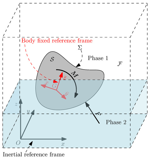 We consider an inertial reference frame and a body fixed frame , which defines the orientation of with respect to (see Figure 1). G is the center of mass of and the superimposed bar () identifies the vectors expressed in body fixed coordinates.
