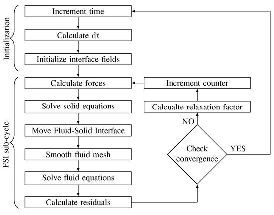 The FSI problem is solved through a partitioned (or segregated) approach, which means that the mathematical models for the fluid flow (i.e., Equations (1) and (4)) and for the solid motion (i.e., Equations (5)–(9)) are integrated separately [2]. To accomplish the interaction between the fluid and the structure, communicates and to the solid and communicates the displacement to . A strong or tight, coupling is required to ensure convergence when the density of the solid is comparable or lower, than the fluid density [1,2]. Being the algorithm segregated, such a coupling is accomplished through the iterative procedure reported in Figure 2 [1,2].