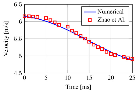 Comparison between numerical and experimental results for the specimen velocity during the water impact of a rigid wedge. Experimental data are retrieved from Reference [78].