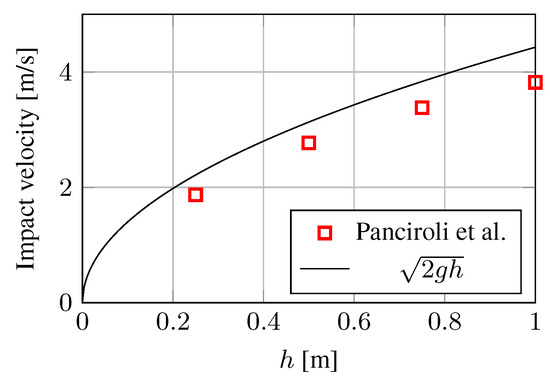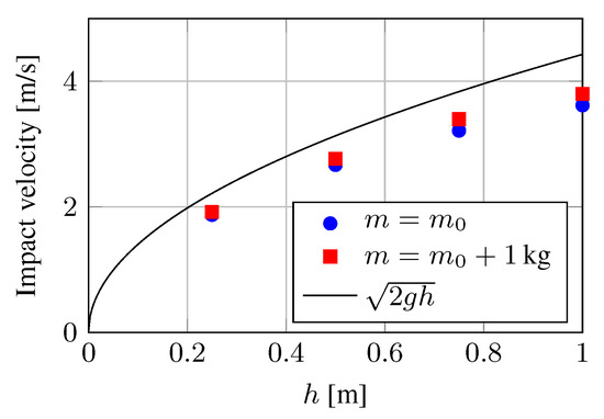 The obtained impact velocity is reported in Figure 7, as a function of the specimen mass and drop height. For more details on the experimental setup, the reader can refer to References [81,84,85].
