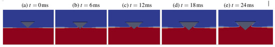 Evolution of the free surface during water impact for m. CFD results for: (a) ms; (b) ms; (c) ms; (d) ms; (e) ms.