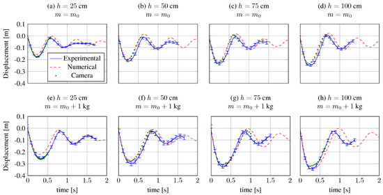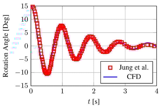 Numerical results are compared to experimental measurement from Reference [79] in terms of vertical displacement of the center of mass. We denote with and the experimental and numerical displacement, respectively. Figure 5 and Table 1 show the good agreement between the proposed numerical model and the experimental data for all the considered cases. The accuracy of CFD is quantitatively assessed by the average relative error, evaluated as