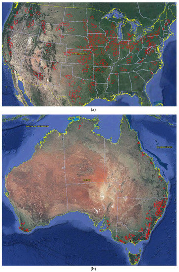Maps of (a) the United States and (b) Australia with catchments included in this study, partly based on information from [20,21].