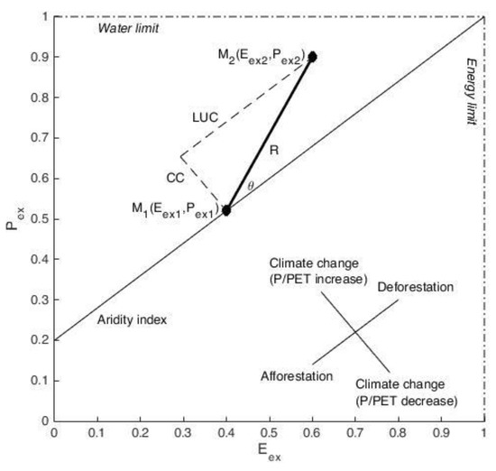 Adapted Tomer and Schilling [13] framework illustrating how the fractions of excess water and excess energy respond to climate and land-use changes. The points M1 and M2 are the fractions of excess water and energy of the pre-change period (Pex1, Eex1) and the post-change period (Pex, Eex2), respectively. The resultant length (R) is the magnitude of the combined influence of land use and climate changes.