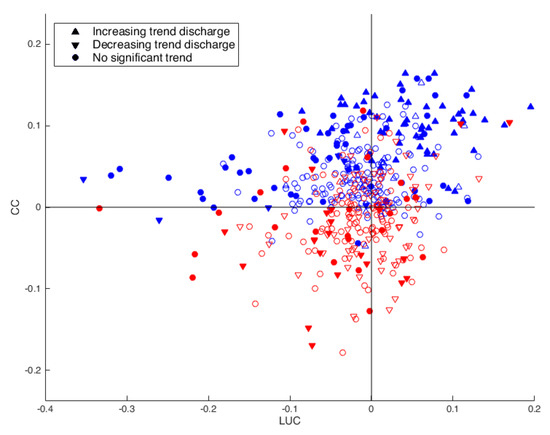 Contribution of land use change (x-axis) and climate change (y-axis) for the American (blue) and Australian (red) catchments. Filled symbols indicate a significant value of (LUC) and/or climate change (CC) and open symbols indicate a non-significant value.