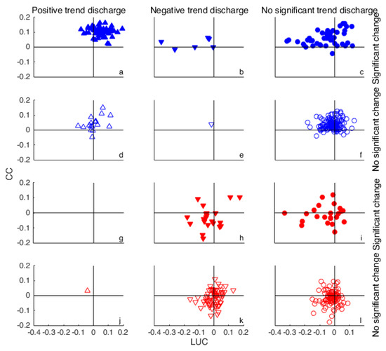 The difference between the two countries is the most obvious one. The American catchments hardly have negative values for CC, while many Australian catchments have CC values between −0.2 and 0. This indicates that the ratio P/PET for nearly all catchments in the US is increasing, while in Australia it is increasing and decreasing. The second observation is the trend in the discharge. A positive discharge trend (Figure 4a,d,g,j) is shown for catchments with higher values for CC than catchments with a negative discharge trend (Figure 4b,e,h,k). Catchments without a significant discharge trend (Figure 4c,f,i,l) have CC and LUC values in a wider range: close to the origin as well as further away and in all directions. Furthermore, catchments with significant CC and/or LUC values (Figure 4a–c,g–i) are located further from the origin than catchments without significant CC and/or LUC values (Figure 4d–f,j–l).