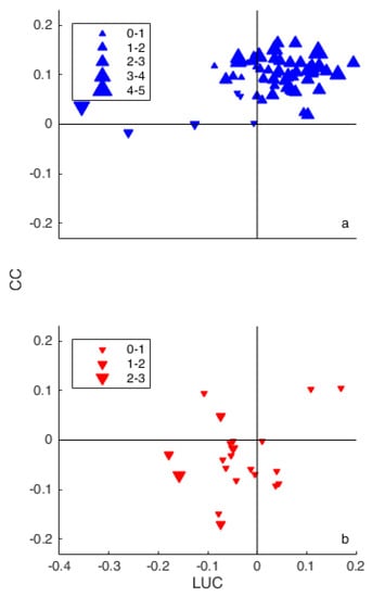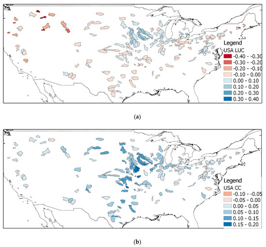 Spatial distribution of LUC (a) and CC (b) values of the American catchments.