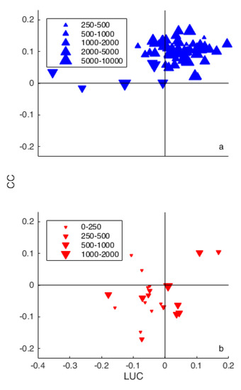 Contribution of land use change (x-axis) and climate change (y-axis) for (a) the American and (b) Australian catchments with a significant trend in discharge and significant LUC and/or CC values. The surface area of the catchments is indicated by the symbol sizes and shown in km2.