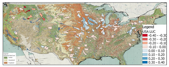 Figure 8 shows the LUC values on top of the historical land use distribution in the United States in 1950 [34]. The spatial distribution of LUC is to some extent related to the pattern as shown in the historical land use map. In the forests the LUC values are negative and in cropland the values are positive. This indicates that in the forests, afforestation has taken place, and in the croplands, deforestation. Afforestation might also include increased forages and conservation cover, and deforestation might also include conservation tillage and removal of perennials. In the middle part of the United States where grassland is present, the LUC values are close to zero, indicating that land use did not change. These observations indicate forests have become denser and cropland has become less dense. In particular the latter observation is hard to understand, because most farming activities have increased. However, this increase could have taken place in combination with deforestation although evidence is not present for this explanation. For Australia (not shown), LUC values can hardly be related to the historical land use distribution, because the LUC pattern is less clear and the resolution of the historical land use map [35] is coarse compared to the map of the United States.