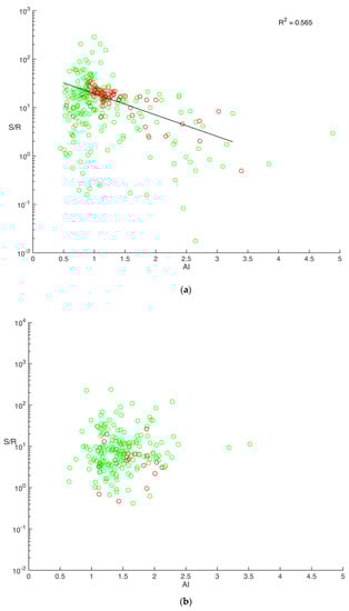 Ratio of Sen’s slope estimator (S) and the resultant length (R) in mm yr−1 as a function of the aridity index (AI) for (a) American catchments and (b) Australian catchments. Red points indicate catchments with a significant trend in discharge and significant LUC and/or CC values and green points are the other catchments. The black trend line for the American catchments is based on the red points and the corresponding coefficient of determination (R2) is shown.