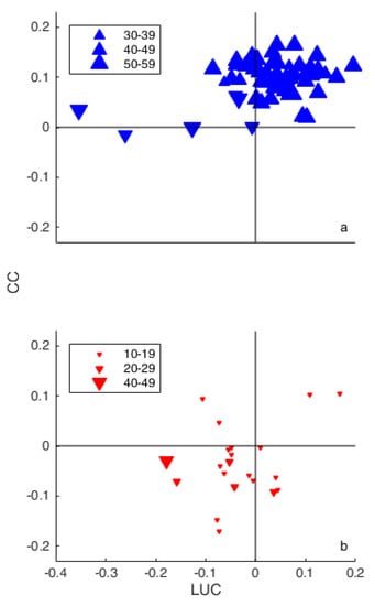 Contribution of land use change (x-axis) and climate change (y-axis) for (a) the American and (b) Australian catchments with a significant trend in discharge and significant LUC and/or CC values. The length of the total measuring period is indicated by the symbol sizes and shown in years.