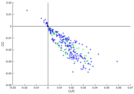Differences in contribution of land use change (x-axis) and climate change (y-axis) between calculating with variable and constant potential evapotranspiration values for all American catchments. Green crosses indicate a Cfa climate and blue crosses indicate other climates.