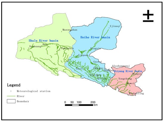 The Hexi Inland River Basin (HIRB) is located in the northwest of China, covering an area of approximately 27.11 × 104 km2, within the range of 37°17’–42°48’ N and 93°23’–104°12’ E. It has a typical continental arid climate with an annual mean precipitation of 248 mm, gradually decreasing from east to west. The annual mean temperature over the basin is 5.8 °C, increasing from the mountainous to the plain, with strong evaporation that amounts to 1095 mm on average. Both the temperature and the evaporation show great differences between day and night. The whole basin is divided into three major river basins: the Shiyang River Basin (SYRB), Heihe River Basin (HRB), and Shule River Basin (SLRB) from east to west.