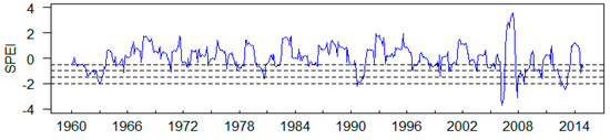 The SPEI is a simple multi-scalar drought index that combines temperature and precipitation data. It is based on the original SPI calculation procedure. Firstly, use the TH [23] equation to calculate the monthly potential evapotranspiration (PET) (mm); then calculate the difference between the precipitation (P) and for the month using the formula . Lastly, choose the Log-logistic distribution to model values, and the resulting cumulative probabilities are transformed into a standardized variable [13]. Detailed descriptions of the SPEI calculation can be found in the references of Vicente–Serrano et al. [13], Beguería et al. [30], and Um et al. [36]. In this study, we analyzed the SPEI series at a 12-month scale, which represented the accumulated water deficits of 12 months and reflected the inter-annual variation of drought.