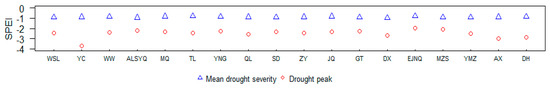 Figure 4 and Figure 5 show the statistics of the three drought characteristics based on the Run theory. The mean drought severity ranges from −0.79 and −0.96, belonging to light drought level, and are presented very close to each other for all stations, while great differences are found for the drought peak varying from −1.99 and −3.68, in which YC station experienced the highest drought peak (in March 2007), 1.2–1.8 times to other stations (Figure 4). As for the drought duration, we counted the total duration, as well as the maximum duration of drought events for all stations during the period of 1960 to 2015 (Figure 5). It ranged from 194 to 260 months for total duration, with an average of 216 months across the basin, in which MZS and MQ stations ranked as the first two with the longest total drought duration. The maximum drought duration varied greatly across the basin, from 22 to 123 months. It should be noted that EJNQ station, although it experienced the least numbers of drought events (13 times) with nearly none at the extreme level (Table 4), showed a minimum drought peak of −1.99 (Figure 4) and had the longest drought duration of up to 123 months (more than 10 years) (Figure 5), occurring from June 2005 to August 2015. Such long-term drought duration inevitably led to the deterioration of the ecological environment and social economy.