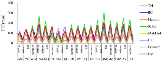 Figure 6 shows the intra-annual distribution of PET values. Similar seasonal variations in PET values are found from different models for most parts of the study area; uneven intra-annual distributions with initially increasing and then decreasing from January to December with an occurring maximum value in July. Compared with the benchmark TH model, five of the other models (BC, Szász, PT, Penman, and PM) presented higher values no matter the month and season as a whole, in which Szász gave the highest values during the middle of the year (from April to September) for most stations. Makkink presented similar values with the benchmark during the summer season (June, July, and August) and higher values during the other seasons. Hamon gave much lower PET values during the period of April to September. Comparatively, the intra-annual distribution curves from Penman and PM overlap the most. It should be noted that PET values derived from the benchmark equation were near to zero during the winter season (January, February, and December), which was mainly due to the fact that when the temperature was below 0 °C, the PET calculated by TH was equal to zero.