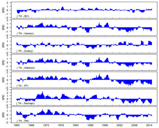 For other stations, similar conclusions can be drawn that SPEIBC, SPEISzász are similar to SPEITH, with nearly similar patterns found in the plots of TH–Makkink, TH–PT, and TH–Hamon. Furthermore, the differences between SPEITH and SPEIPenman (or SPEIPM) are relatively large. It can also be concluded that the SPEITH identified more climate drying trends than other SPEI series since the differences between them always change from positive values to negative values over time as a whole.