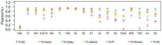 Comparing the correlation coefficients for each station, we found that SPEIBC, SPEISzász, and SPEIHamon ranks the first three as the most correlated with SPEITH for 18 stations, followed by SPEIPT and SPEIMakkink. The poorest correlations are observed between SPEITH and SPEIPM, and a similar weak correlation for SPEITH and SPEIPenman can be seen. Overall, SPEITH are most correlated with the SPEI derived from the temperature-based PET model, followed by those from the radiation-based model. The SPEI from the comprehensive-based models have poorest correlations with SPEITH.