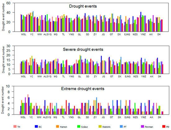 Through previous analysis, we know that there are some differences in SPEI values derived from different PET models. Figure 9 shows the number of drought events and number of severe and extreme drought events for all stations. On average, the BC model produced more drought event numbers, followed by the Makkink, Penman, and PT models. Hamon and TH produced close drought event numbers, while Szász and PM produced less drought event numbers comparatively. As for the severe and extreme drought events, different results are found. BC, as well as the PT models still overestimated the drought event numbers, while Makkink and Penman produced close numbers with TH, while Szász, PM, and Hamon tended to underestimate the drought event numbers.