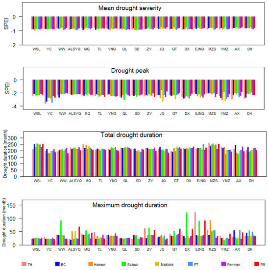 For a better understanding of the effects of different PET models to drought characteristics, we compared the drought severity, drought duration, and drought peak derived from the different SPEI series based on the Run theory, with the results shown in Figure 10. The mean drought severity extracted from the different SPEI series were basically close to each other at all stations, ranging from −0.73 to −0.99, and all belonging to the light drought level. As for the drought peak, results from BC, PT, and PM were in good agreement with TH, all showing the largest drought peak at YC station although the peak value differed a little (−3.34, −3.50, −2.73, and −3.68 for BC, PT, PM, and TH). Another point was that most of the drought peak derived from Penman and PM were smaller than those from other models, indicating that the drought detected from these two equations was not as serious as those from other models.