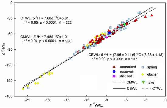 The δ2H and δ18O values of all bottled water exhibit significant covariance (Figure 2). Best-fit lines for the Chinese bottled water (CBWL), Chinese tap water (CTWL) [27] using station means, and Chinese meteoric water (CMWL) [29] are described by the equations: