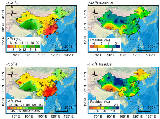 Spatial distribution of δ2H and δ18O values of bottled water and residuals (observation minus estimate) across China. Sub-region boundaries and base map as for Figure 1.