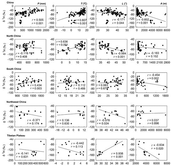 Correlations between measured δ2H values of bottled water and four environmental parameters (annual mean precipitation P (mm), annual mean temperature T (°C), latitude L (°) and altitude A (m)) for the period 1970–2000. The top row shows all data for the whole of China, and below are the four natural regions.