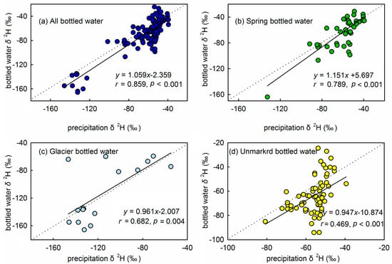 Correlations between δ2H in precipitation [25] and (a) all bottled water samples, (b) spring-sourced bottled water samples, (c) glacier-sourced bottled water samples and (d) source unmarked bottled water. The solid line is the linear least squares fitting. The dotted line is the line of slope equality (y = x).