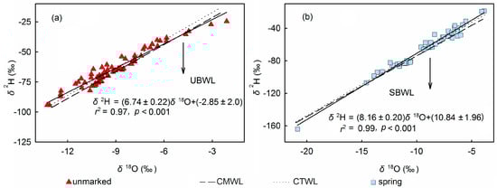 Comparison of the relationship between δ2H and δ18O of unmarked-sourced (a) and spring-sourced bottled water (b). The unmarked-sourced water (UBWL) and spring-sourced water (SBWL) lines are shown by solid lines.
