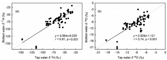 Correlation between δ2H (a) and δ18O (b) in bottled water and local tap water. From the tap water database provided by [27], 80 stations of tap water (Figure 1) adjacent to the origin of bottled water sites were examined. The dotted line is the line of equality (y = x).