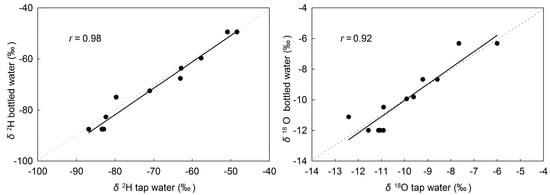 Hydrogen and oxygen isotope values of spring-sourced bottled water plotted against corresponding tap water isotope ratios. The dotted line is the line of equality (y = x) and the solid line is the linear least squares fitting.