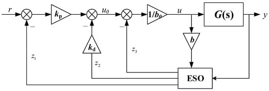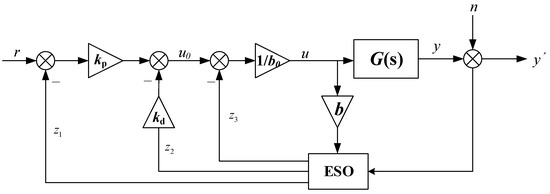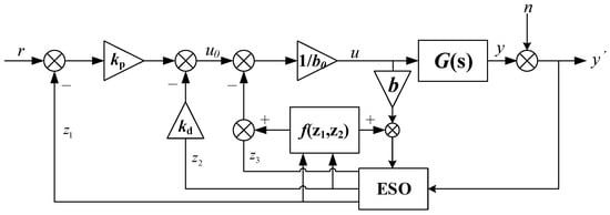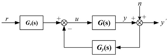 Figure 3 and Figure 4 show the ADRC structure in the presence of measurement noise at the measurement end, where y denotes the real output and y′ is the measurement. As we can see from figures, there are two inputs in the whole closed-loop systems: reference r and noise n. The factors affecting the control variables u are r and n. Besides, it is revealed in [34,35] that the ADRC is actually of two-degrees-of-freedom structure; therefore, we converted the above structure to the structure shown in Figure 5. For simplicity and generality, we define the transfer function from y to u as Gy(s) and the transfer function from r to u as Gr(s).